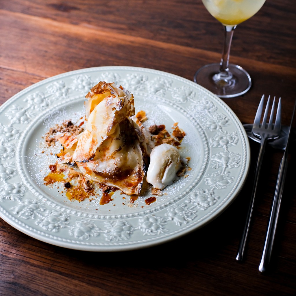 Dusted with fermented butter and Cassonade sugar, the crêpe is torched to golden perfection for a crisp brûlée finish. This luxurious plate is elevated with crunchy puff pastry, buckwheat and almond crumble, and a scoop of velvety vanilla ice cream—creating a rich, multi-layered symphony of flavors and textures.