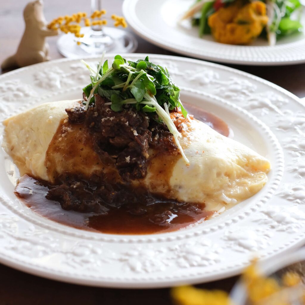 Melt-in-your-mouth beef sinew slow-cooked in a rich red wine and onion reduction, deepened with the bold umami of Hatcho Miso and our signature tomato sauce.Tucked inside is a fragrant sesame and ginger-infused rice. While the dish boasts the powerful savoriness of beef, the refreshing aroma of ginger, crunchy herbs, and pickled spring onions provide a clean, light finish. Accented with Shichimi (seven-spice chili) for a sophisticated, spicy kick—this is an Omelet Rice crafted for the adult palate.