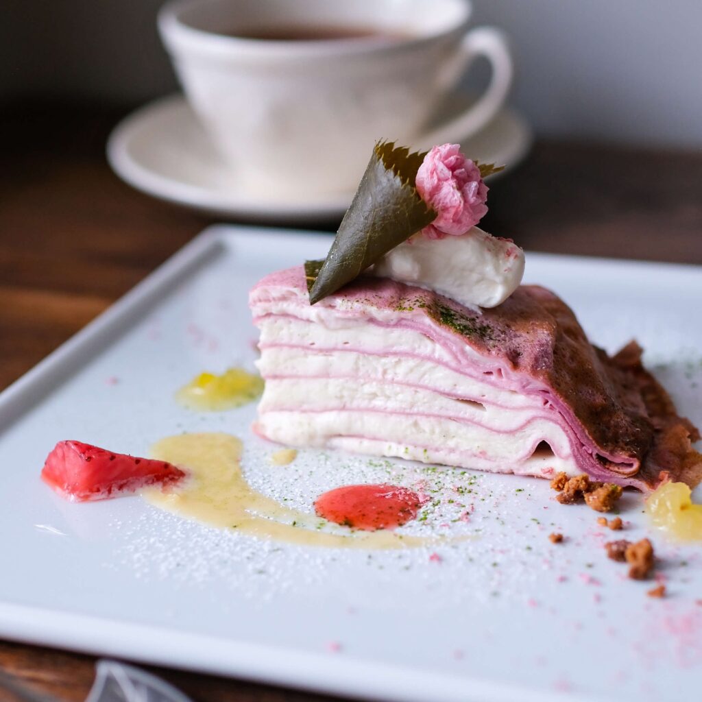 A delicate stack of cherry leaf-infused rice flour crêpes, naturally tinted a soft pink with beets.