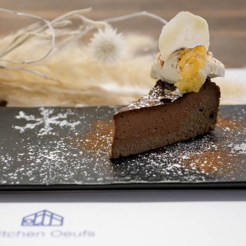 Indulge in our rich chocolate cheesecake, made with premium couverture bittersweet chocolate, and a fragrant hojicha-infused cheesecake, perfectly baked to create a harmonious blend of flavors.Savor the smooth, melt-in-your-mouth texture achieved through careful baking time and temperature control.This luxurious treat is accompanied by refreshing, lightly sweetened orange confit and aromatic rum-infused marron glacé, offering a sophisticated dessert experience.